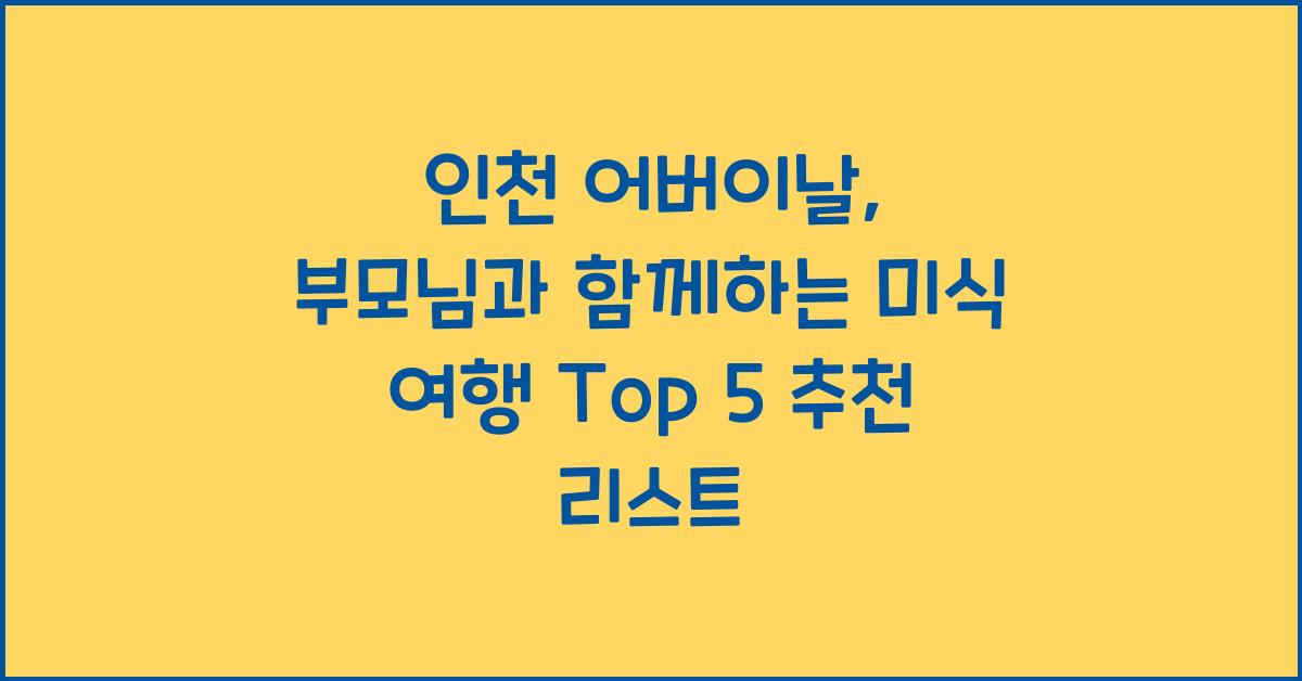 어버이날은 부모님께 감사의 마음을 전하는 특별한 날입니다. 이 특별한 날, 부모님과 함께 인천에서 미식 여행을 계획해 보세요. 인천에는 다양한 맛집, 전통 시장, 그리고 특별한 경험이 기다리고 있습니다. '인천 어버이날, 부모님과 함께 떠나는 미식 여행 Top 5'를 소개합니다. 이 리스트는 부모님과의 소중한 추억을 쌓고, 다양한 미식을 경험할 수 있도록 도와줄 것입니다.